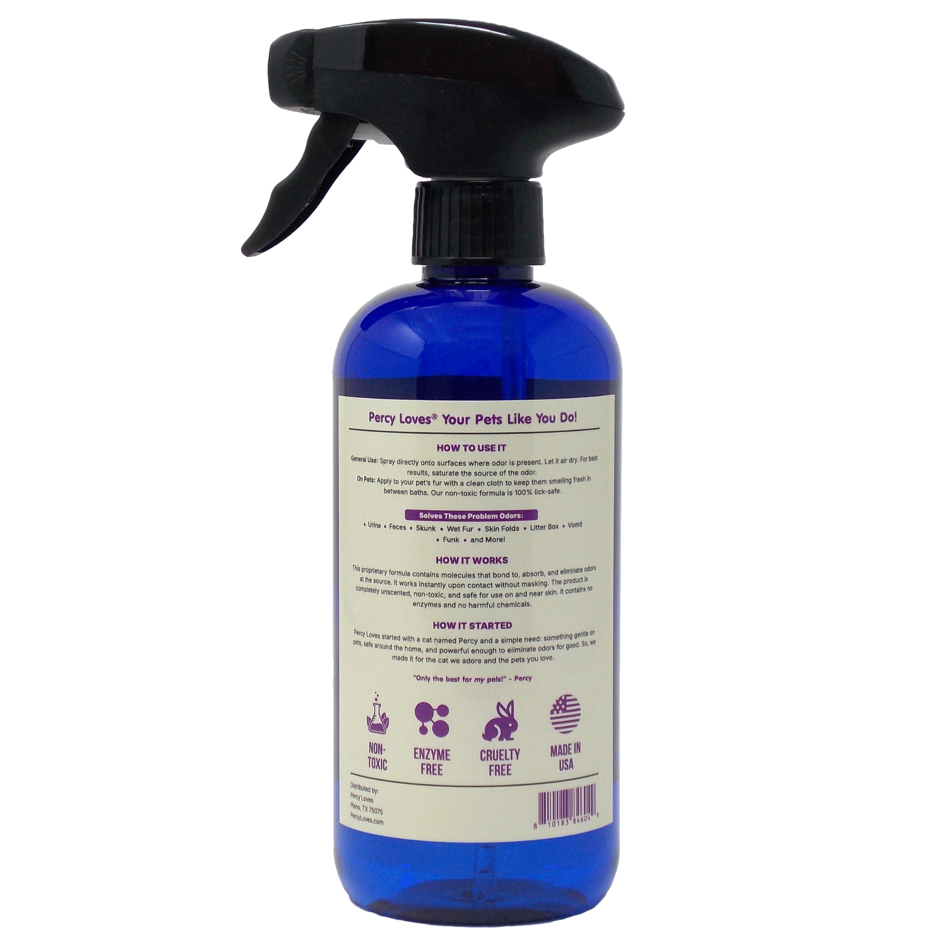 This proprietary formula contains molecules that bond to, absorb, and eliminate odors at the source. It works instantly upon contact without masking. The product is completely unscented, non-toxic, and safe for use on and near skin. It contains no enzymes and no harmful chemicals.